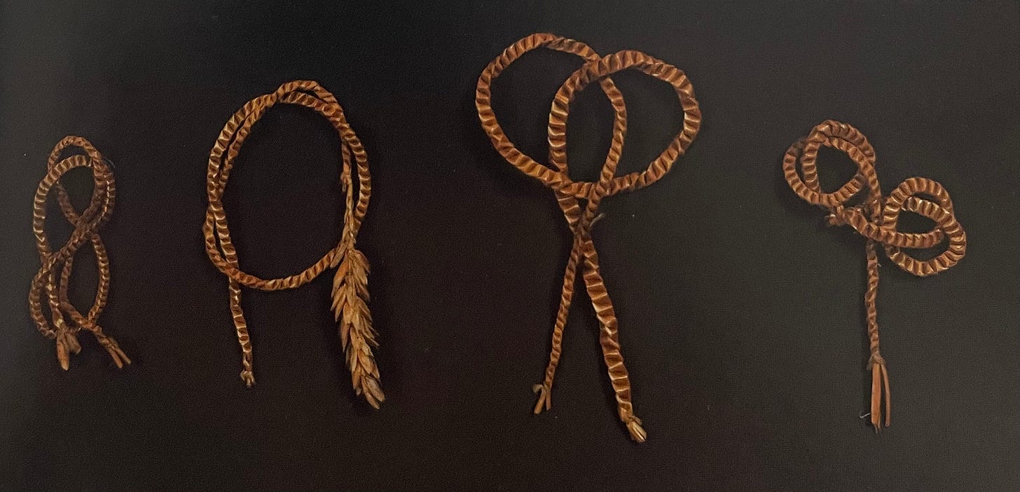Last month I briefly mentioned Harvest Knots. Some examples made locally (County Antrim) over one hundred years ago are pictured above. These beautiful and intricately crafted objects were made mainly from the straw gathered from the grain harvest, rather than the hay made from grass earlier in the year. They were worn as charms of protection, fertility, or love. They were worn in the gladness of a successful harvest. Young women would wear them in their hair and the men wore them in buttonholes or in their caps. The areas in which harvest knots were popular correspond to those which were planted by the British in the sixteenth and seventeenth centuries, so it is perhaps not too much of a stretch to say that they were an import from English harvest traditions. There is some suggestion that they were gifted as love tokens, but it is without much evidence. Similarly, they may have been worn as an advertisement that the wearer was available to work the harvest, but again we simply do not know as that information, along with the practice of weaving them, has long since passed from knowledge.